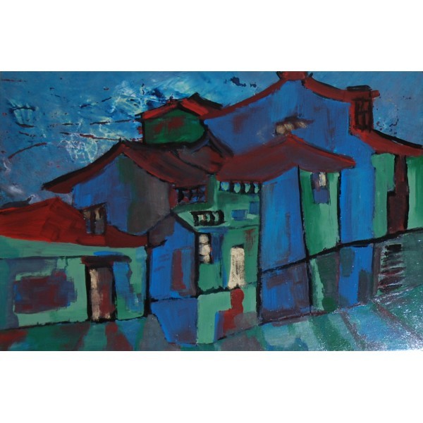 Tableau laqué La nuit tombe sur le village au bord du lac - Art création tableaux laqués